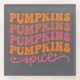 The "Pumpkins Spice" design is a fun and vibrant representation of the beloved fall flavour, pumpkin spice. The design prominently features the word "PUMPKINS" repeated five times in a bold, retro-style font with rounded edges, each instance stacked on top of the other. The repetition emphasizes the word and makes the design instantly recognizable as a celebration of all things pumpkin.