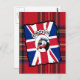 Funny punk guineafowl bird collage wearing a mohican mowhawk hairstyle with and an anarchy text with a red white and blue British union jack and a royal Stewart Scottish tartan background. For matching guinea fowl products and more fun animal characters visit the VINTAGEPRINTSORE.
