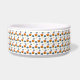 Discover our charming dog bowl featuring a playful pattern on a white background. The design showcases adorable orange dog houses with red roofs and dark brown arched doors, alongside cute blue-grey dog faces with black noses, tiny black eyes, and red tongues. The pattern is completed with blue-grey paw prints and yellow bones, all evenly distributed for a fun and lively look. Perfect for your furry friend, this stylish and functional dog bowl adds a touch of whimsy to mealtime.