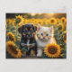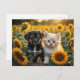 An image of dark puppy and white-creany kitten sitting together in a sunflowers field.