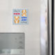This is a cute refrigerator magnet that is handy for busy households, too! The text says "Dog is Fed! Dog is Not Fed!" in grey, red and blue, and with a cute little brown and white puppy dog cartoon image. The images and text are placed on a light blue grey background.
