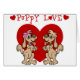 2 cute puppy dogs standing in front of a big red heart and the term Puppy Love is available on girl's t-shirts, stickers, tote bags, greeting cards, key chains, coffee mugs and more.