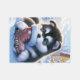 A playful, fluffy Alaskan Malamute puppy interacts with a red boot in a snowy winter scene. The charming setting includes a cozy cabin and snow-covered trees, evoking warmth and holiday cheer.