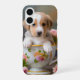 A charming puppy peeks out from a beautifully decorated floral teacup, surrounded by vibrant blooms. The camera performs a gentle zoom-in, capturing the puppy's curious expression and playful demeanor. Soft, diffused lighting enhances the warm colors of the flowers and the puppy's fur, creating a cozy, inviting atmosphere. The scene feels intimate and heartwarming, perfect for showcasing this adorable moment in 4K detail.