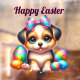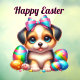 a cute puppy wearing a bow, surrounded by vibrantly coloured Easter eggs.