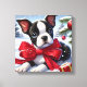 A cute Boston Terrier puppy wearing a red bow under snowfall beside holiday decorations