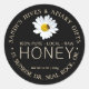 Eye-catching realistic daisy with honeybee. Honey printed in embossed style gold gradient text. Text is written in gold on black background.