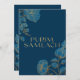 An elegant blue card with flowers for Purim gifting that says Purim Sameach.