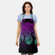Purple and aqua haunted graveyard Halloween apron. This all-over print apron displays a haunted cemetery in aqua blue and purple with gravestones, spooky trees, a witch, an owl and bats.