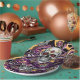Día de Muertos or Halloween party paper plates in black, purple, gold with a sugar skull.