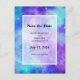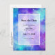 Save the date postcard with a cosmic abstract background. Swirling vibrant colours of light blue, pink and purple. White stars scattered around.