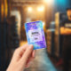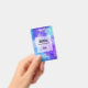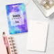 Name badge with a cosmic abstract background. Swirling vibrant colours of light blue, pink and purple. White stars scattered around.