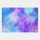 Wrapping paper sheets with a cosmic abstract background. Swirling vibrant colours of light blue, pink and purple. White stars scattered around.
