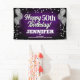 Fun banner sign for indoors or out, featuring festive silver metallic balloons on both sides of the design with sparkly, silver metallic confetti on a rich textured purple coloured background for your personalized birthday banner. This product doubles as a wonderful milestone birthday keepsake.