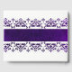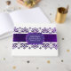 Elegant wedding guest book done in white with a purple damask pattern and a purple satin looking ribbon, across the middle. A purple decorative plaque text area has white custom text ready to personalize, for your special day.