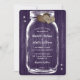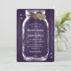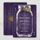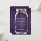 Rustic purple wedding invitation featuring a mason jar and burlap hearts on a barn wood background. Easily personalize this mason jar wedding invitation with your wedding details.