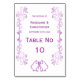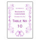 Purple coloured wedding table number bells design. You can customise this purple coloured wedding table number with your own wedding details. Should you require any help with customising then contact us through the link on this page. Bells scrollwork design personalised purple coloured wedding table number