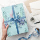 A beautiful gift wrap in of blue berries and blue glittery feathers on a rough texture paper backing in dark turquoise