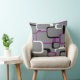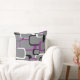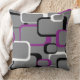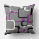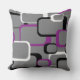 A fun design of retro inspired squares done in purple, black and white against a grey background on a throw pillow.