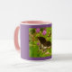 Purple Combo Mug with Black Monarch Feeding on Flower Nectar and Summer Foliage Background..