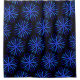 This shower curtain features a bold design statement. A black background is the canvas for a repeating pattern of striking blue, abstract flower petal shapes that cover the entire curtain, creating a vibrant and energetic look.