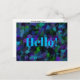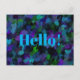 Purple, Blue, Green and Black art began as a photo of a peacock's colourful feathers and transformed into this colourful Hello! postcard.