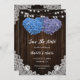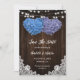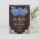 Romantic rustic purple and blue floral wedding save the date card featuring hydrangea hearts against a barn wood background adorned with white floral lace and string lights. Two burlap hearts on a rustic wood background decorated with delicate floral lace at the back.