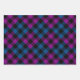 A festive purple and blue buffalo plaid set of holiday wrapping paper.