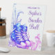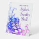 Sneaker ball welcome table sign with pretty purple and blue sneakers and diamonds on a purple and blue swirl background. This sneaker ball welcome sign is easily personalized for your event by simply adding your details.