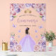 This lovely quinceañera welcome sign features a border of lilac purple and blush pink flowers on a clear background. A gold tiara, a dark-haired girl in a lilac purple princess dress and small purple butterflies decorate the text. The word "Quinceañera" appears in elegant purple handwriting script. Personalize it with the name of the guest of honour and the date in charcoal grey sans serif font.