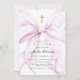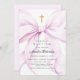 Coquette baptism invitation that features an elegant purple bow and a gold cross.