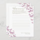 Purple and gold boho butterflies and glitter (digital, not real foil!) decorate this simple and elegant custom bridal shower "Whose memory?" game card that features modern script calligraphy. Personalize it fully, with the bride's name and the date.