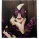 A brunette haired woman wearing a purple butterfly masquerade mask with purple butterflies all around in a backdrop of black