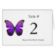 Lovely wedding or party reception table number tent card done in white, with graphics of a purple and black butterfly decorating the left side. Black text is customizable to read what you wish. Customize the number and text for each table you need a card for.
