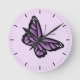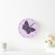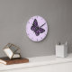 This clock features a beautiful illustration of a purple butterfly on a lilac background colour. The clock face is made of simple and stylish black lines.