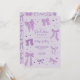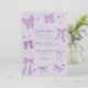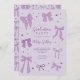Coquette purple bow theme graduation party invitation card featuring illustration of ribbons and hearts.