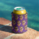 Funny custom face cut-out can cooler with a purple background, personalized with a photo for any party. To make the face cut-out, click the button to edit the design and the remove background option, or download any mobile or computer app, create the cut-out, and upload a transparent png file.