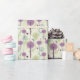 Lavender, white, aqua, and sage green dandelion design on a soft yellow background.
