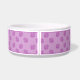 Purple dog paw print pattern background with a darker purple badge that has a personalizable text area for the name of the pet. The font is a lovely script font in white colour.