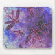 Gorgeous flitting warm cerise pink dragonflies flit on a hazy purple background.