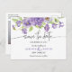 Save the date postcard designed with pretty hand painted watercolor flowers in purple and lilac.