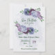 Beautiful romantic wedding save the date invitation featuring dusty blue and purple flowers and some green leaves .