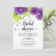Bouquet with purple ethereal flowers and cursive script handwritten calligraphy floral spring wedding bridal shower invitation. The upper part is covered with a beautiful bouquet of violet purple flowers with green leaves.
