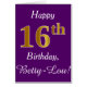 This simple birthday card design features the message "Happy 16th Birthday", with the "16th" having a faux gold-like appearance. It also features a custom name, and a purple background. It could be given to somebody who is celebrating their sixteenth birthday.