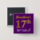 This simple square button design features a message like "NameHere’s 17th Birthday!", with the "17th" having a faux/imitation gold-like colouring look, on a purple coloured background. The name can be personalized. Buttons like these could perhaps be worn by guests at a birthday party for somebody who is celebrating their seventeenth birthday, where the party is being held in a large area with lots of other people present (such as a city park or a theme park). [~Z0000166]