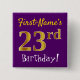 This simple square button design features a message like "First-Name’s 23rd Birthday!", with the "23rd" having a faux/imitation gold-like colouring look, on a purple coloured background. The name can be personalized. Buttons like these could perhaps be worn by guests at a birthday party for somebody who is celebrating their twenty third birthday, where the party is being held in a large area with lots of other people present (such as a city park or a theme park). [~Z0000166]