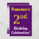 This birthday party invitation design features a message like "Francisco’s 2nd Birthday Celebration!", where the name can be personalized, and where the number "2nd" has a faux gold-like appearance. It also features a purple coloured background. The event details on the back can be customized. It could be used to invite people to somebody’s second birthday celebration or birthday party. [~Z0000121]