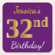 This simple paper coaster design features a message like "Jessica’s 32nd Birthday!", with the "32nd" having a faux/imitation gold-like colour appearance, on a purple coloured background. The name can be personalized. Personalized paper coasters like these could perhaps be used at a birthday party for somebody who is celebrating their thirty second birthday. [~Z0000197]