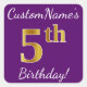 Purple, Faux Gold 5th Birthday + Custom Name Square Sticker