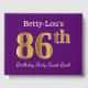 This guest book design features the ordinal number "86th" with a faux/imitation gold-like appearance. It also features a custom name, and a purple coloured background. It could be used at a party for somebody celebrating their eighty sixth birthday. [~Z0000057]